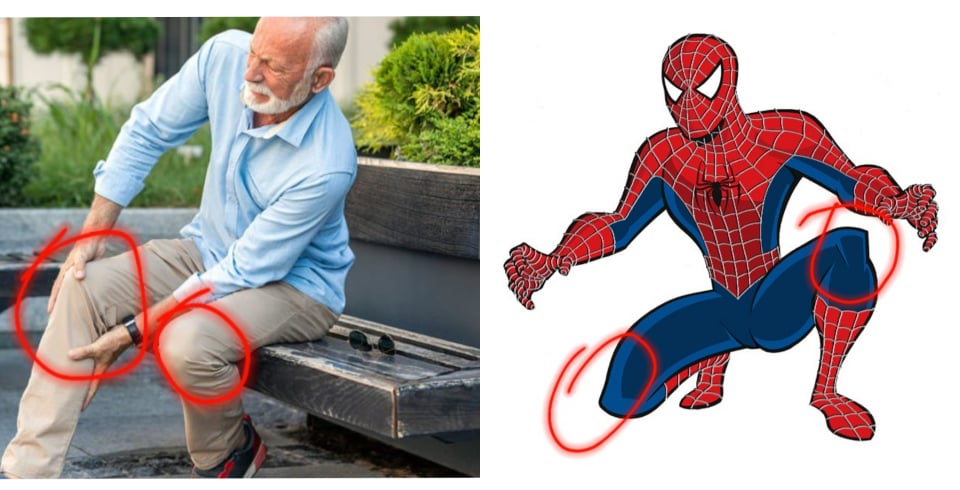 The difference between your grandfather and spider-man is that the latter has two functioning knees. Also, honour or whatever. One could argue that the desirable knees are fictional. It is a lot easier to be impressive when you are entirely made up. I too could have the power to stick to walls if an all-powerful creator decided that I was able to do that. Though that may be a semi-credible point against the imaginary web-slinger, it does not change the fact that your grandfather has cast the first stone.