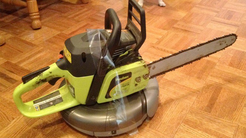 I have no hope against a chainsaw. Though I can move around the sharp bits with ease, I have sensitive ears. The constant yammering of this machine would be enough to throw me. I must surrender in order to avoid a ’70s massacre.