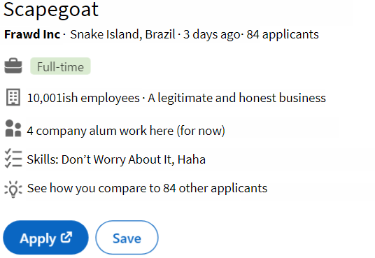 Things may have been rough lately but a life-changing opportunity has just landed on your lap! Here’s a posting for a job for which you would be the perfect candidate. You even have some former co-workers over there. You haven’t heard from them lately and their social media has been scrubbed, which is unfortunate. They probably love their job so much, they don’t care about posting online.